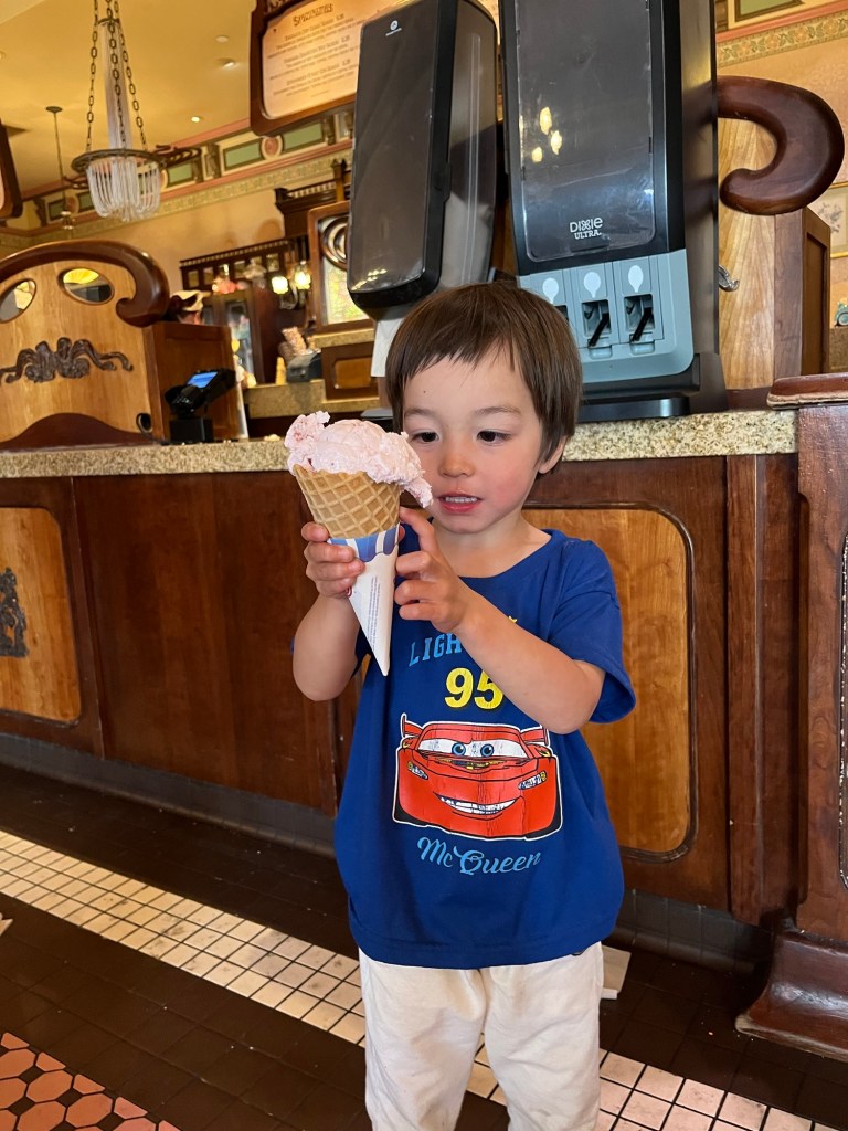 So we ambled instead. We got Tov a strawberry ice cream cone bigger than his face– his first real cone!– and while we sat by the sidewalk, watching all the other Disneylanders pass by, he licked and licked and licked his cone until the whole thing was gone into his belly.