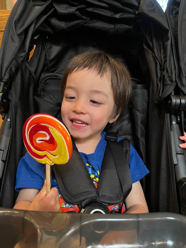 Then, because Tov had been asking for a lollipop all day, David caved and got him a cherry lollipop, also the size of his face.