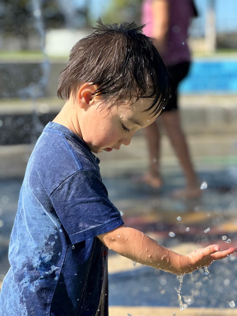 David and Tov find a water play fountain by the lake. Tov gets soaked. He is the only one splashing. The other kids are apparently not allowed to get wet. They eye Tov from their safe dry spot with envy.